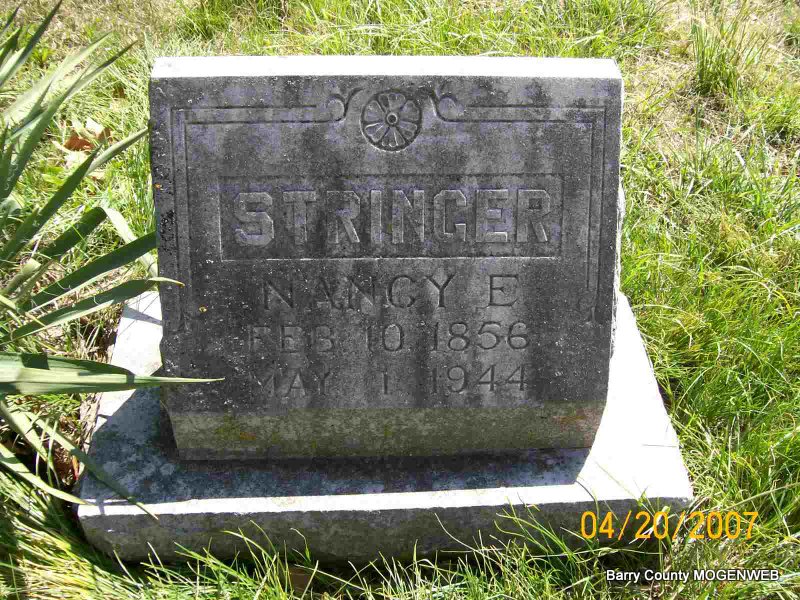 Research Note: Nancy Ellen (Benbrook) Stringer was the wife of Cornelius A. Stringer, married on Mar. 22, 1873 in Barry Co., MO. She was the daughter of George Washington Benbrook and Rebecca Ann (Dixon) Benbrook. | Family Records Jerry Ray Benbrook Jr. 1999 Transcription Photo Jay Trace |