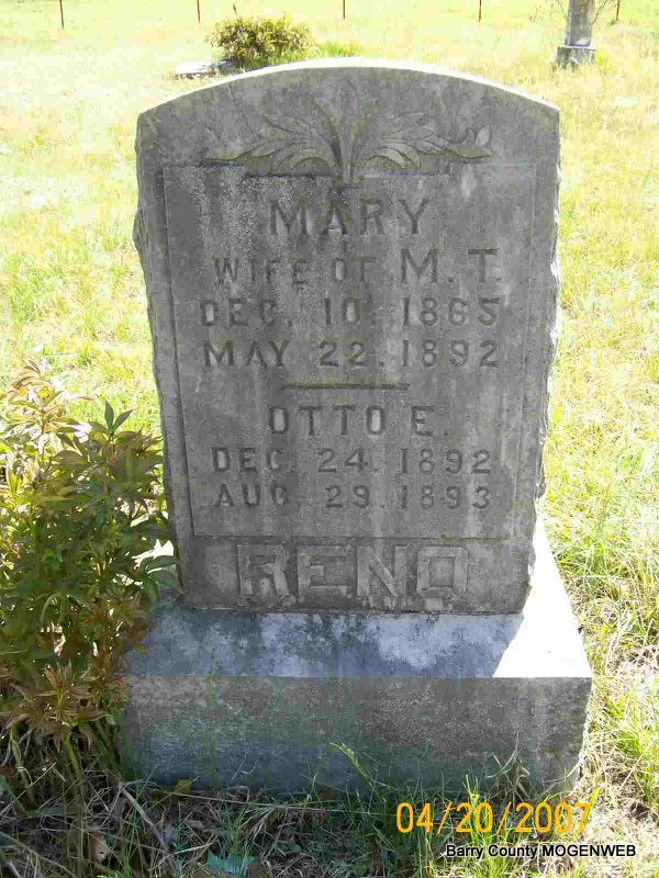 SSW: Mollie - Inscription: "Meet Me in Heaven" - Research Note: He was a grain farmer. Son of William Reno born France and Anna Shultz born PA. George Reno of Monett, MO was the informant on the death certificate. Spanish flu was the cause of death. - Cassville Democrat, Feb. 21, 1920 - G. M. Reno, an old citizen of near Monett, died of pneumonia, aged about 63 years. He was born in Pennsylvania and came to Barry County in the early 70's and has lived her since. He is survived by several sons and daughters. He was a highly respected citizen. | Death Certificate Online Newspapers Phyllis Long 1999 Transcription Photo Jay Trace |