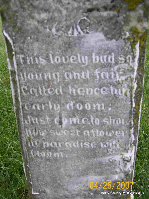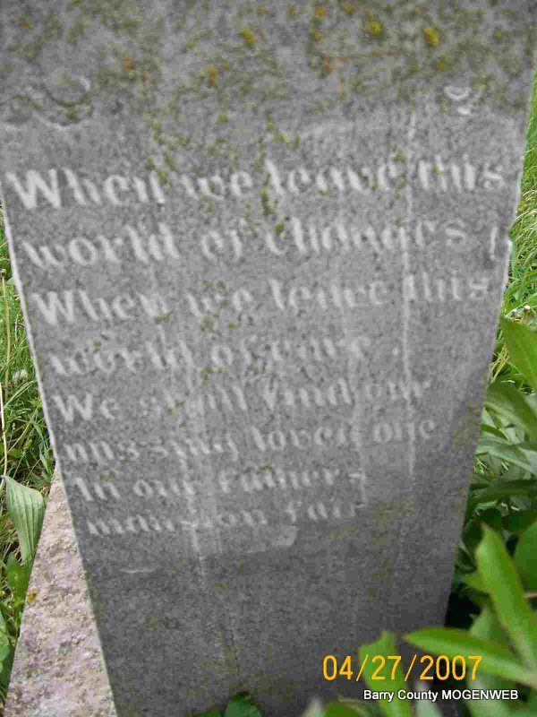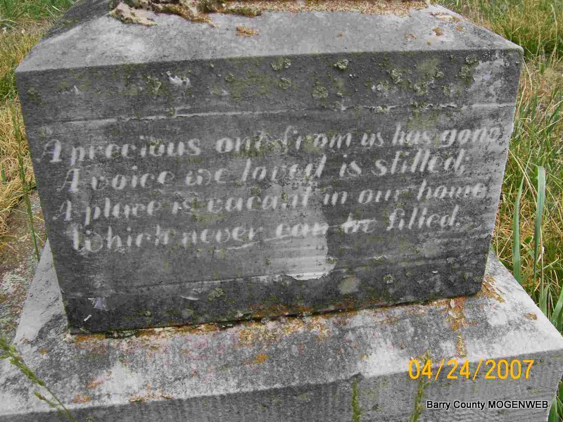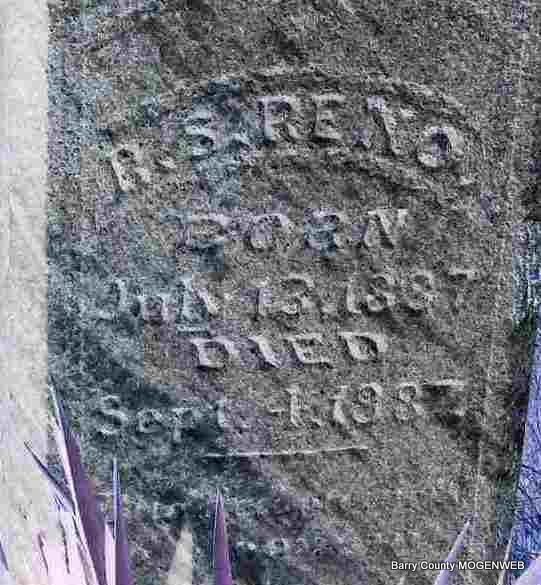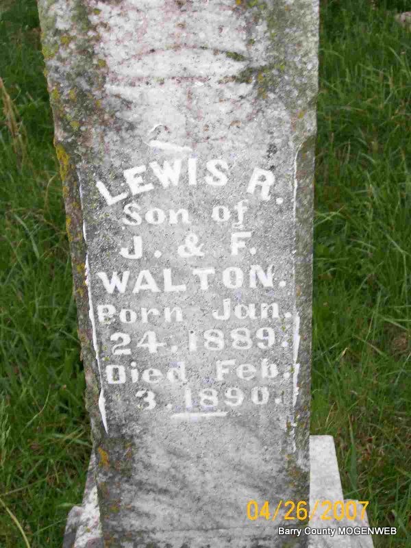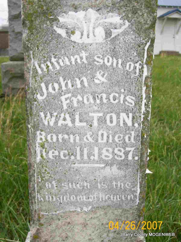 | WALTON, Infant | Dec. 11, 1887 | Dec. 11, 1887 | Inscription: "Infant son of John and Frances Walton" - Research Note: John was a son of Thomas Walton and Elizabeth Bolton. John Walton married Frances Gifford on Oct. 31, 1886 in Barry Co., MO. - Back of Stone | MO Marriage Records Phyllis Long Photo Jay Trace |