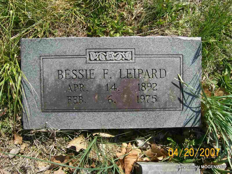 | LEIPARD, Bessie Florence (HOHLAUS) | Apr. 14, 1892 | Feb. 6, 1975 | Research Note: Bessie Florence Hohlaus married George Leipard on Apr. 26, 1925 in Carthage, Jasper Co., MO. | MO Marriage Records Phyllis Long 1999 Transcription Photo Jay Trace |