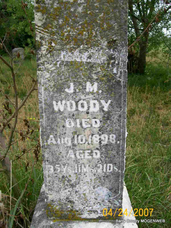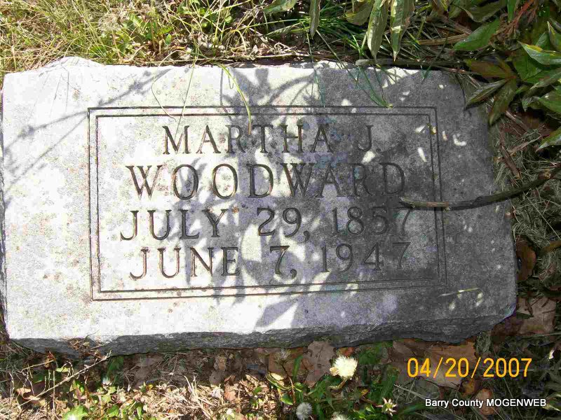 Research Note: Her death certificate places her death in McDonald Co., MO and names James Woody born GA as her father. Mother not listed. Her husband was Jeff Woodward. James Woodward of Rocky Comfort, MO, gave the information. - Daughter of James Woody and Sarah Vanzant. Jefferson Davis Woodward second married Martha Woody on Oct. 14, 1912 in Monett, Barry Co., MO. Jeff is buried at Concord Cemetery with his first wife Millie House. - 1910 Census, Shoal Creek, Barry, Missouri - Mary E. Woody, head, age 54, single, born GA, father born TN, mother NC; Martha J., sister, age 52, born GA, father born TN, mother NC; Callie, sister, age 49, single, born GA, father born TN, mother NC. - There is a stone listed at Rock Island Confederate Cemetery, Rock Island, Rock Island County Illinois for James Woody. Inscription: " Pvt. Prov Army CSA", died Jan. 5 1864. There is a newer stone set at Vanzandt Cemetery, Fannin Co., GA for Sarah, born Apr. 5, 1831, no death date. James Woody married Sarah Vanzant on May 11, 1851 in Union Co., GA. | Death Certificate Donna Cooper MO Marriage Records Census Phyllis Long 1999 Transcription Photo Jay Trace |