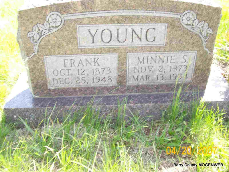 SSW: Minnie S. - Research Note: His death certificate named his father as John Young and his mother as Emily C. Henry. Minnie S. Young was listed as his wife. Oliver C. Young of Purdy, MO, gave the information. - Cassville Republican,Thursday, March 21, 1918 - North Purdy: Willis Meador and wife and daughter, Lois, visited at Frank Young's Sunday evening. - Cassville Republican, Thursday, Dec. 12, 1918 - Mr. and Mrs. Frank Young who live south of Monett visited at the county seat and transacted business Friday. Mr. young lived when a boy in the Pasley locality. - Cassville Republican, Sept. 4, 1919 - North Purdy: Frank Young has began work on his new house. | Death Certificate Donna Cooper Online Newspapers Phyllis Long 1999 Transcription Photo Jay Trace |