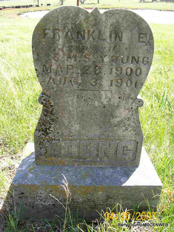 | YOUNG, Franklin Earl | Mar. 28, 1900 | Aug. 3, 1901 | Inscription: "Son of F. J. and M. S., Darling Earl We Miss Thee" - Research Note: Son of Frank Young and Minnie Robbins. - F. E. Y. | Note Phyllis Long 1999 Transcription Photo Jay Trace |