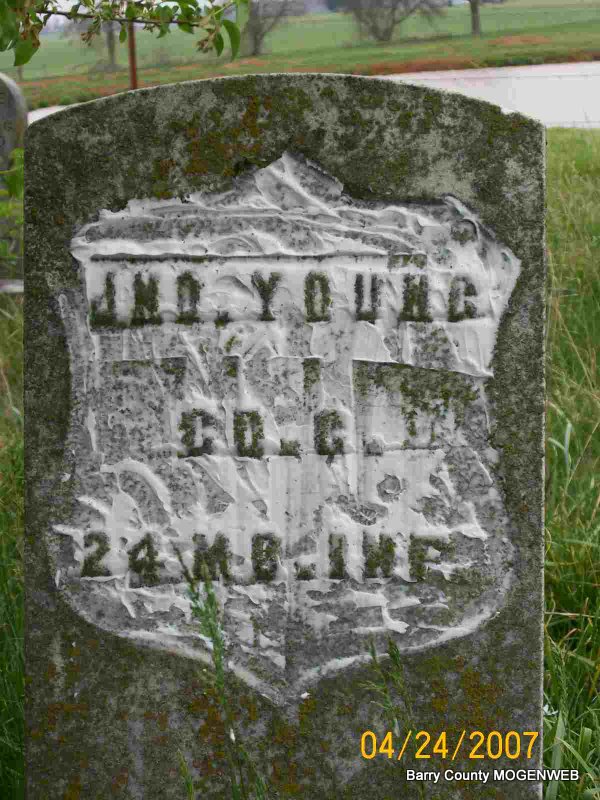 Inscription: "CO G 24 MO INF" - Research Note: Civil War Stone. He first married Matty Jane Broyles and second Emily C. Henry. In 1880, John was listed as age 38 and born in IN. He reported that both of his parents were born in KY. He was living in Flat Creek Twp., Barry Co., and his wife was named Emily. | Census Phyllis Long 1999 Transcription 1880 Census Photo Jay Trace |
