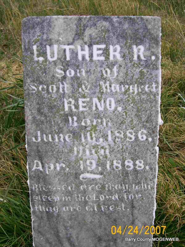 | RENO, Luther R. | June 10, 1886 | Apr. 19, 1888 | Inscription: "Son of Scott and Margaret" - Research Note: Son of Scott and Eliza Margaret Reno. Scott was the son of Benjamin Reno and Mary Parks. | Note Phyllis Long 1999 Transcription Photo Jay Trace |