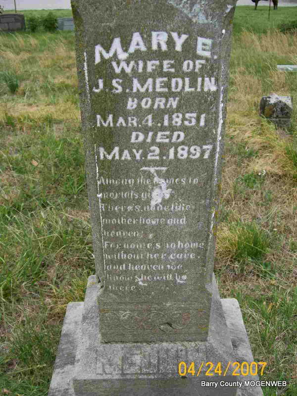 | MEDLIN, Mary Elizabeth (MATTINGLY) | Mar. 4, 1851 | May 2, 1897 | Inscription: "Wife of J. S." - Research Note: Daughter of Lewis H. Mattingly and Caroline Mary Tate. Mary E. Mattingly married John Shadrack Medlin on Apr. 18, 1871 in Barry Co., MO. | Census MO Marriage Records Phyllis Long 1999 Transcription Photo Jay Trace |