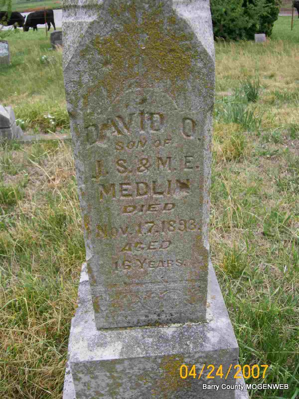 | MEDLIN, David Oscar | Abt. 1877 | Nov. 17, 1893 | Inscription: "Aged 16 yrs. - Son of J. S. and M. E." - Research Note: Son of John Shadrack Medlin and Mary Elizabeth Mattingly. - Cassville Republican, Nov. 23, 1893 - Departed, Nov. 17th, 1893, Oscar, son of John and Elizabeth Medlin, aged almost sixteen years. He went as an angel from earth to glory, after a sickness of thirty-six days of severe fever which he bore with patience. When taken sick he was under conviction, and the Lord was mighty to save. He left evident proof that he was a happy boy before he died. During his sickness he sang some beautiful hymns and clapped his hands as he sang, "I am happy on the way." A few days before his death he told a friend, who was his nurse all through his sickness: "I am not afraid to die." A few hours afterwards, looking his pa in the face a moment or two, he turned his eyes heavenward and said, "Bless the Lord!" This is consolation enough that Oscar has gone to rest. Oscar left many warm friends to mourn his loss with the bereaved family. | Note Phyllis Long Obit Online Newspapters Jack Fly 1999 Transcription Photo Jay Trace |