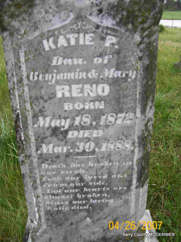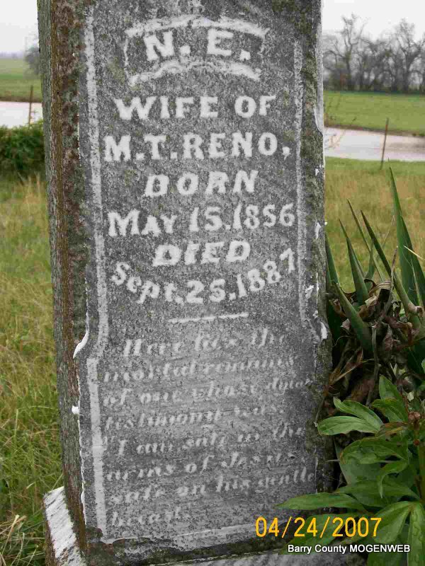 | RENO, Nicea Emeline (SMITH) | May 15, 1856 Barry Co., MO |