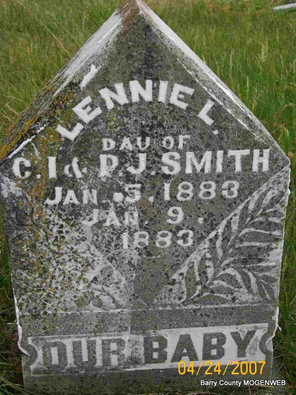 | SMITH, Lennie L. | Jan. 5, 1883 | Jan. 9, 1883 | Inscription: "Dau. of C. I. and P. J., Our Baby" | 1999 Transcription Photo Jay Trace |