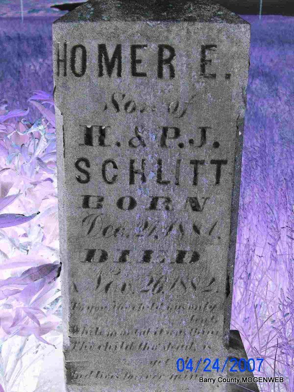 | SCHLITT, Homer E. | Dec. 21, 1881 | Nov. 26, 1882 | Inscription: "Son of H. and P. J." - Research Note: Son of Henry Schlitt and Permelia Jane Martin. - Computer Enhanced Negative | Note Phyllis Long 1999 Transcription Photo Jay Trace |