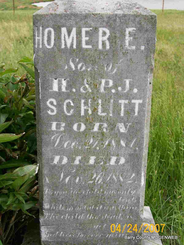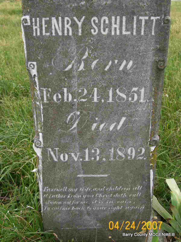 Research Note: His wife was Permelia Jane (Martin) Hensley. She second married Presley W. Hensley and died in 1936 in Wagoner, Wagoner Co., OK and is buried there. - Cassville Republican, November 24, 1892 - King's Prairie News: Died, Nov. 13th, Henry Schlitt, a farmer of stones Prairie. He leaves a wife and four children to mourn his loss. He was about 41 years old. He had been sick about four months with the slow fever. He was buried at the Pisgah Cemetery. There was a large crowd at his funeral to take a last look at the remains and to pay Henry their last respects. He was a highly esteemed citizen of our community and his bereaved family has our sympathy. - Photo of Henry - Photo of Henry and Permila | Obit Phyllis Long Headstone Louise Todd 1999 Transcription Online Newspaper Photo Jay Trace |