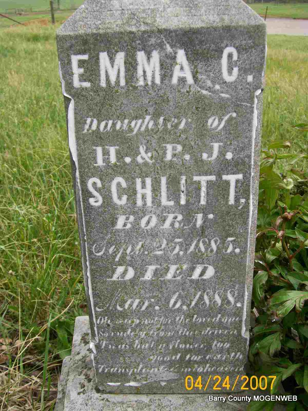 | SCHLITT, Emma Catherine | Sept. 25, 1885 | Mar. 6, 1888 | Inscription: "Dau. of H. and P. J." - Research Note: Daughter of Henry Schlitt and Permelia Jane Martin. | Note Phyllis Long 1999 Transcription Photo Jay Trace |