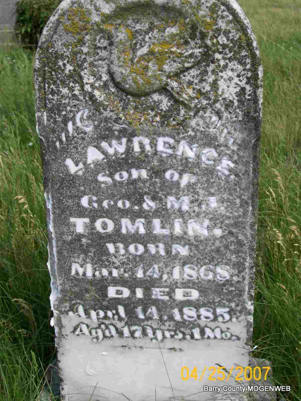Inscription: "Son of George and M. J. - age 17 years 1 month" - Research Note: Son of George Tomlin and Mary Jane Stockton. | Census Phyllis Long 1999 Transcription Photo Jay Trace |