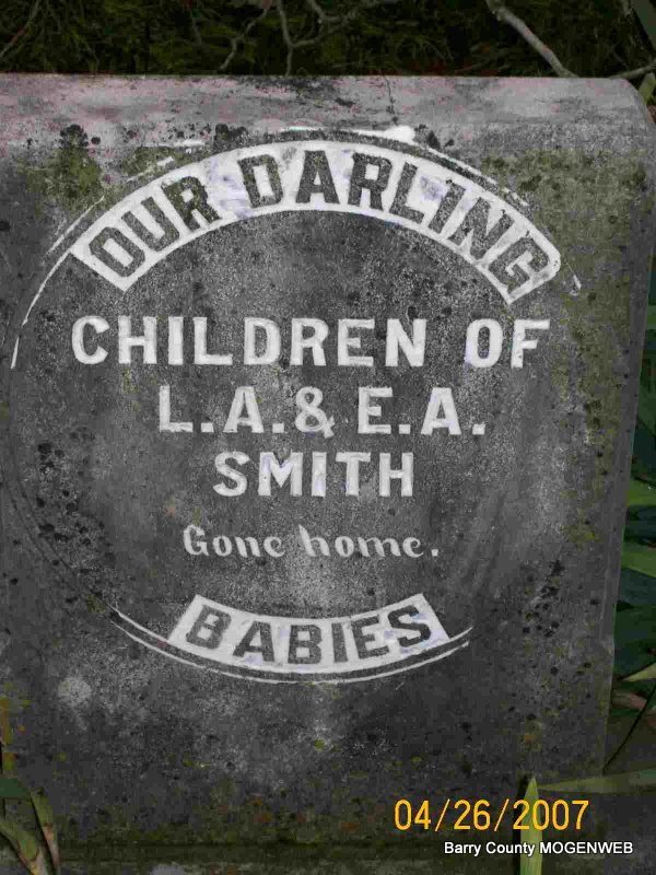 | SMITH, Babies | No Date | No Date | Inscription: "Children of L. A. and E. A., Gone Home, Our Darling Babies" - Research Note: Children of Rev. Lewis Albin Smith and Elizabeth A. Burrows. | Note Phyllis Long 1999 Transcription Photo Jay Trace |