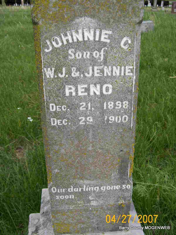 | RENO, Johnnie C. | Dec. 21, 1898 | Dec. 29, 1900 | Inscription: "Son of W. J. and Jennie, Our Darling Gone So Soon" - Research Note: Son of William Jackson Reno and Jennie Burrows. William was a son of Benjamin Reno and Mary Parks. | Note Phyllis Long 1999 Transcription Photo Jay Trace |