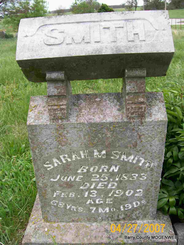 | SMITH, Sarah Melvina (FLY) | June 25, 1833 | Feb. 13, 1902 | Inscription: "Age 68 yrs. 7 mo. 19 days" - Research Note: Sarah was born in Carroll Co., TN and died Barry Co., MO. She was the wife of Lewis Smith and a daughter of William Asher and Nicea (Sooter) Fly. - Inscription on Stone | Note Shirley Writer Chang 1999 Transcription Photo Jay Trace |