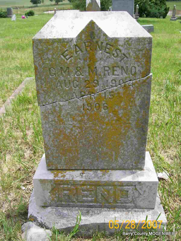 | RENO, Earnest | Aug. 29, 1904 | Apr. 15, 1906 | Inscription: " on of G. M. and M." - Research Note: Stone is broken. | 1999 Transcription Photo Jay Trace |