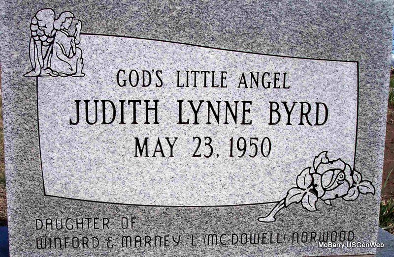 Jan. 25, 2025 | Inscription: "Daughter of Winford and Marney L. (McDowell) Norwood" - Research Note: She was probably not the daughter of Winford Norwood. Her mother was Marney Luella (McDowell) (Byrd) (Finn) (Norwood) Johnson. According to the SS Claims Index, Marney changed her name from Mayme Elizabeth to Marnie Luella. Short bio by Marney (Judith's mother)states that "We (meaning Winford) were married on Apr. 10, 1966". Judith was born 1950. She is listed in her mother's obit as Judy Byrd of Neosho. - Goodman, MO resident. Preceding her in death were her parents, Winford A. and Marney L. Norwood and one stepbrother. Surviving are three stepsisters. Judy became disabled at a young age. She was a member of Gunter Methodist Church. | Note Fohn Funeral Home Phyllis Long |