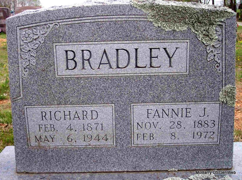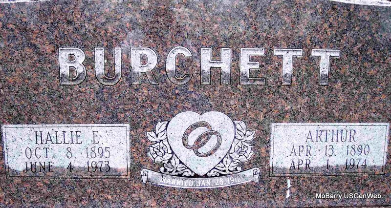 | BURCHETT, Hallie E. (KING) | Oct. 8, 1895 | June 4, 1973 | SSW: Arthur - Inscription: "Married Jan. 28, 1912" - Research Note: Daughter of Henry Smith King and Susan Riddle. Hallie King, age 16, married Arthur Burchett, age 21, on Jan. 28, 1912 at Smith King's, Barry Co., MO. H. S. King, father of Hallie, gave consent. - February 1, 1912, Thursday, Cassville Republican - Licensed to Wed: Arthur Burchett, 21, Purdy and Hallie King, 16, Purdy. | Family Donna Cooper Online Newspapers Census Phyllis Long Photo Diana Cope |