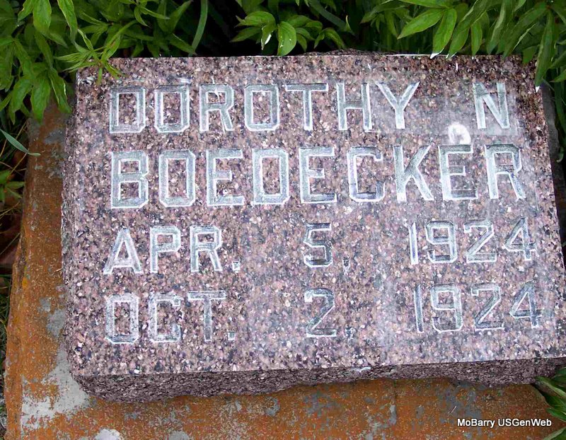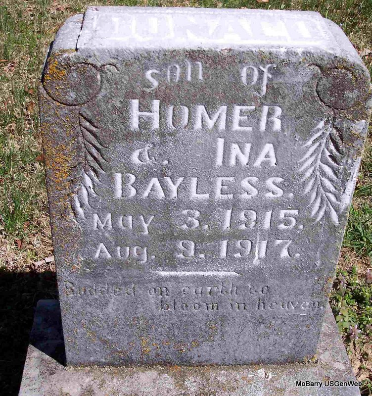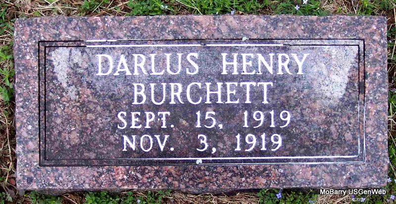 | BURCHETT, Darlus Henry | Sept. 15, 1919 | Nov. 5, 1919 | Research Note: He was a son of Arthur and Hallie E. (King) Burchett and a grandson of James Preston and Samantha Caroline (Long) Burchett. - Cassville Republican, Nov. 13, 1919 - Arthur Burchett and wife buried their little baby at the Mt. Pleasant Church Wednesday of last week. they have the sympathy of this neighborhood. | Family Donna Cooper Online Newspapers Phyllis Long Photo Diana Cope |