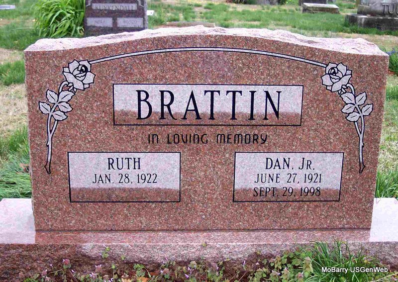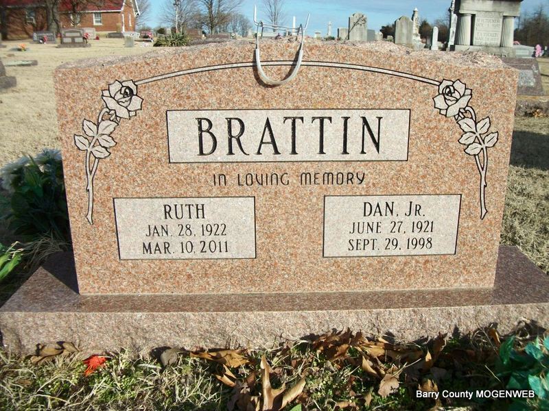 SSW: Dan, Jr. - Research Note: She was a daughter of Lon and Maye (Montgomery) Shoopman. On April 13, 1941, in Benton County, Arkansas, she was united in marriage to Dan Brattin, Jr., who preceded her in death on September 29, 1998. Also preceding her in death were her parents; one son, Danny Joe Brattin in 1942; one brother, Paul Shoopman and one sister, Ruby Prier. Ruth grew up and received her education at Butterfield, graduating from high school in 1939. In 1958, she and Dan moved to Redondo Beach, California. They remained there until 1962, when they moved back to Butterfield and became the owners of Brattin Grocery. For ten years she was employed as a cashier for Johnston's Hardware and Variety in Cassville. In the late seventies she was postmistress at Butterfield. She had resided in Carthage since 1994 and since that time was assistant cook at the Over 60 Center, worked in the Salvation Army Thrift Store, the Jasper County Records Department and was a volunteer at McCune Brooks Hospital. - Another Photo | Fohn Funeral Home Phyllis Long Photos Diana Cope |