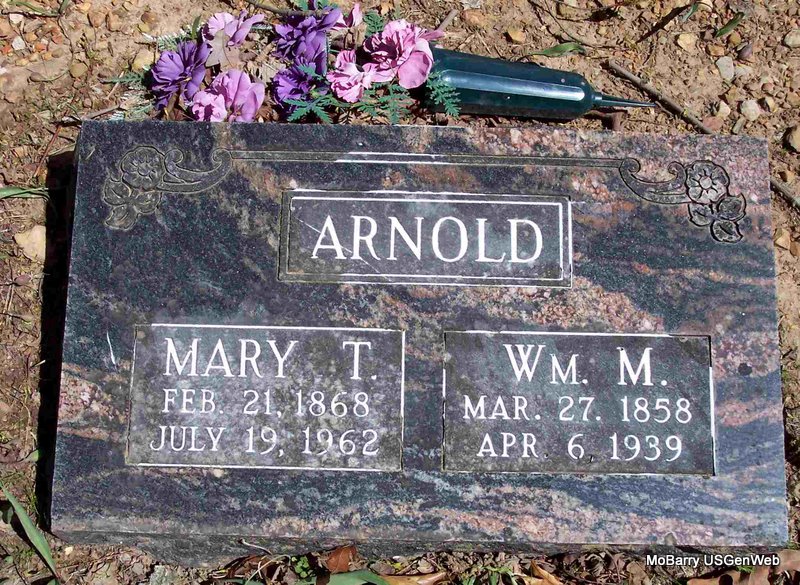 SSW: Mary T. - Research Note: William was a son of Thomas Jefferson and Lucinda (Russell) Arnold,both born TN. Myra Wallace of Sarcoxie, MO was the informant on the death certificate. He was the husband of Mary T. Johnson, and they were the parents of Rosella, Samiarah M., Mary E., Elzer E. , Eltis, and Ethel Leona. - Cassville Republican, Thursday, Oct. 10, 1918 - Butterfield: Mr. and Mrs. W. M. Arnold were visiting their daughter, Mrs. Harry Wallace, on Flat Creek last week. - Cassville Republican, Thursday, January 30, 1919 - W. M. Arnold's all have the flu but are better at this writing. - Cassville Republican, Thursday, April 10, 1919 - W. M. Arnold and daughter, Ethel spent Saturday night and Sunday with Harry Wallace on Flat Creek. - Cassville Republican, Thursday, March 6, 1919 - Butterfield: W. M. Arnold and family visited their daughter, Mrs. J. F. Wilson, Sunday. - Cassville Republican, Thursday, June 19, 1919 - Mr. and Mrs. W. M. Arnold visited their daughter Mrs. A. A. Graves, Sunday. | Family Wilma Fields Death Certificate Phyllis Long Photo Diana Cope |