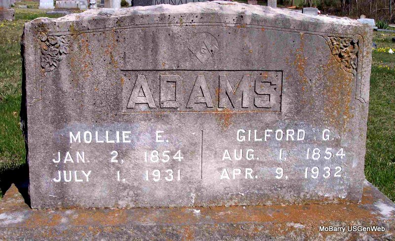 SSW: Mollie E. - Research Note: He was widowed. Son of Alfred Adams born IL and mother's maiden name was Bridges also born IL. His mother was Elizabeth Jane (Bridges) Parmley. She married Alfred Martin Adams on Mar. 26, 1848 in Pope Co., IL. Living in Newton Co., MO, widowed, in the 1870 Census. - June 20, 1912, Thursday, Cassville Republican - Shady Grove News: Mrs. Ollie Gordon of Pierce City and Mrs. Ada Clubb of Joplin are visiting their parents, Mr. and Mrs. G. G. Adams. - Cassville Democrat, March 20, 1920 - Theo. Gordon and family spent Sunday with Mrs. Gordon's parents Mr. and Mrs. G. G. Adams of Butterfield. They were accompanied home by their daughter Miss Lora, who has been near Pierce City attending school the past few weeks. | Death Certificate Online Newspapers Census Phyllis Long Photo Diana Cope |