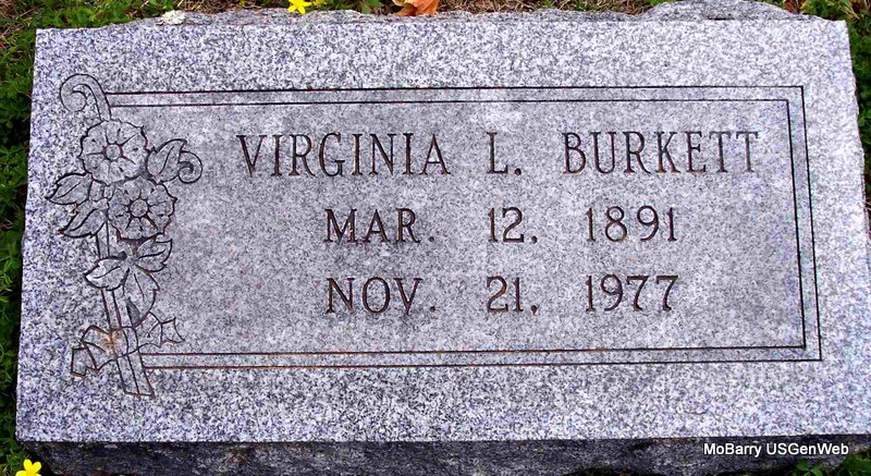 | BURKETT, Virginia L. (HENLEY) | Mar. 12, 1891 | Nov. 21, 1977 | Research Note: Wife of W. K. "Todd" Burkett. - Research Note: Daughter of Darb Henley and Melvina Angeline (Clark) (Wade) Henley. Walter Burkett married Virginia Henley on July 3, 1909 in Barry Co., MO. | Census MO Marriage Records Phyllis Long Photo Diana Cope |