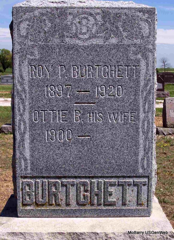 Research Note: Son of James Preston Burchett and Samantha Caroline Long. 1st Husband of Ottie (Lent) (Burchett) Reed. - January 15, 1920, Cassville Republican - Roy Burchett is recovering nicely from the measles and plans on being back to work in a few days. - Cassville Republican, February 5, 1920 - Roy P. Burchett died at the home of his father J. P. Burchett, north of Butterfield, Tuesday Jan. 27, 1920, of pneumonia and a complication of other diseases. He was 22 years, 2 months and 13 days old. He was born and reared mostly in this state. He was at Kansas City taking a course in the Rahe(?) Auto and Tractor school when sickness overtook him. Funeral services were held at the home Wednesday Jan. 28, 1920. Internment made in the Mt. Pleasant cemetery. He was married to Miss Ottie Lent Sept. 20, 1917. He leaves a loving wife, father, mother three sisters and four brothers to mourn his departure. - Photo of Roy | Note Susan Tortorelli Family Donna Cooper Online Obits Phyllis Long Photo Diana Cope |