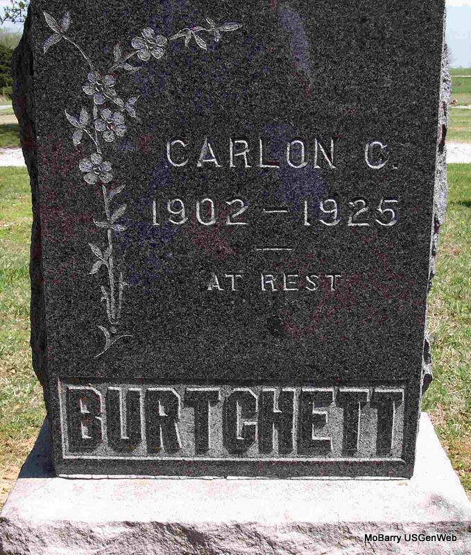 Research Note: Stone reads Burtchett. Death certificate indexed as Carl Preston Burchett. He was a son of James and Samantha Carolina (Long) Burchett. He was struck by an auto. - Cassville Democrat, Saturday, August 8, 1925 - TOM BURCHETT KILLED BY AUTO LAST SUNDAY (Note: Should read Carl or Carlen Burtchett) - PURDY YOUNG MAN STRUCK BY AUTO DRIVEN BY JOHN SCHAD, ON HIGHWAY - Tom Burchett, a son of James Burchett of Purdy, was struck by an automobile, driven by John Schad, a prominent farmer and occupied by his family, living west of Purdy while driving on the state highway south of Purdy, a short distance, at about 5:00 pm Sunday, resulting in Burchett's skull being fractured, his shoulder and arm being crushed with other injuries. Tom Burchett and Eston Morris of Purdy were walking on the highway and Mr. Schad was driving in the same direction and thought the boys would hear his car and get out of the way, but it seems they failed to heed or hear the noise of the car and remained in the roadway. Burchett is reported to be rather weak or absent minded. Other parties came up and among them were O. W. Williams of Monett, who assisted in getting Burchett in the car and taking him to Purdy, while Mr. Schad located a physician to care for the young man. Later he was taken to West's Hospital at Monett, where he died in a short time. The remains were interred in New Church or Mt. Pleasant cemetery, northwest of Butterfield, Monday, at 1:00 pm. Eston Morris who was with Burchett, was slightly injured. Thomas Burchett was 22 years of age and was the son of Mr. and Mrs. James Burchett of Purdy who survive their son, and two brothers, Earl of Monett and another brother Frank of Oklahoma, and two sisters, Mrs. Chas. and Mrs. Ernest Hankins of near Purdy. We understand that Mr. Schad was arrested Monday evening on a warrant issued by Squire Carter of Purdy, charging second degree murder and he gave bond for his appearance. - Cassville Democrat, Saturday, August 8, 1925 - Purdy: A very sad accident occurred on the highway, just south of Purdy Sunday evening, about five o'clock, when Schad, driving an automobile, ran into Carl Burchett, who was walking on the highway, striking him in a manner that knocked him down dragging him some distance, wounding him so seriously that he passed away at 10:30, Sunday night. It was a quite shock to the aged parents, as he was their only child at home with them. The time set for the funeral was 5:00 p.m., Monday. - Mass card states: Carlen Chester Burtchet, Born: December 1, 1902, Died Aug. 3, 1925, Aged 22 yrs. 3 mos, 1 day. | Note Susan Tortorelli Family Donna Cooper Death Certificate Online Newspapers Phyllis Long Photo Diana Cope |