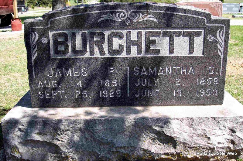 SSW: James P. - Research Note: Samantha was a daughter of Simon Hiram and Martha Tabitha (James) Long. Her parents are buried at Maddy. Mrs. Maggie Hankins of Purdy, MO was the informant on the death certificate. Samantha C. Long married James P. Burchett on Nov. 16, 1873 in Barry Co., MO. | Family Donna Cooper Death Certificate MO Marriage Records Phyllis Long Photo Diana Cope |