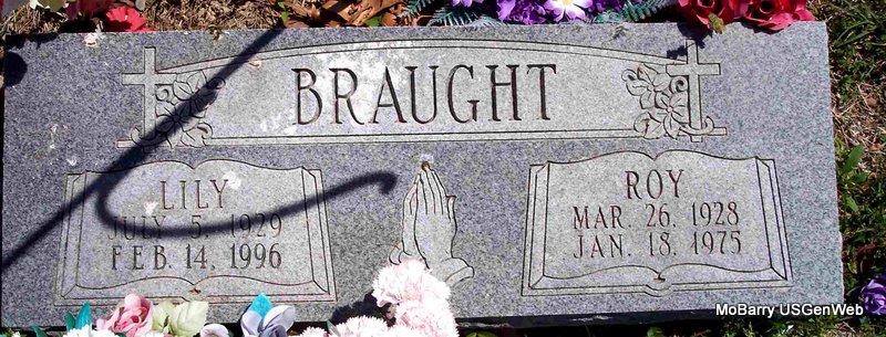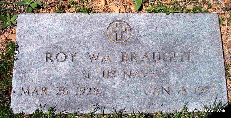 | BRAUGHT, Roy William | Mar. 26, 1928 | Jan. 18, 1975 | SSW: Lilly - Research Note: Served in the Navy from May 29, 1945 to Aug. 16, 1946. Roy William Braught, age 41, married Virginia May Gwinup, age 41, on Feb. 27, 1970 in Mt. Vernon, Lawrence Co., MO. - Military Stone - Inscription: "S1 US NAVY" | Military Records MO Marriage Records Phyllis Long Photo Diana Cope |