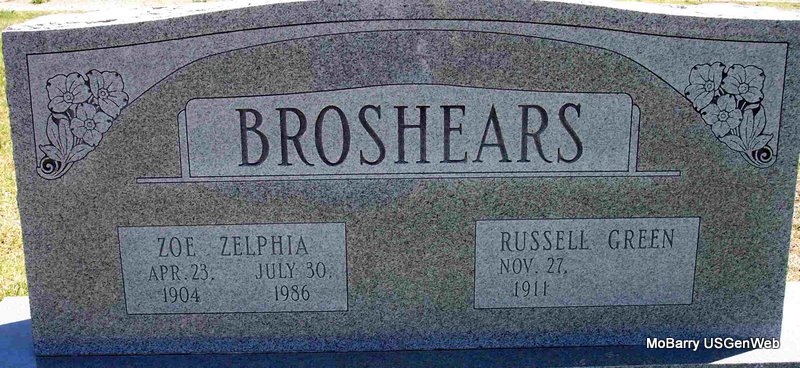 | BROSHEARS, Russell Green | Nov. 27, 1911 | Aug. 7, 1991 | SSW: Zoe Zelphia - Research Note: Son of Emanuel G. Broshears and Alice Virginia Ferguson. | Census Phyllis Long Photo Diana Cope |