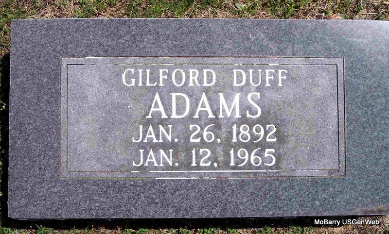 Research Note: Son of Gilford G. Adams and Mary "Mollie" Henley. WW I Draft Registration gave his name as Gilford McDuffie Adams. Gilford Douglas in his death certificate. His wife was Editha Henley. Wally Adams of Cassville, MO was the informant on the death certificate. | Census Death Certificate Phyllis Long Photo Diana Cope |