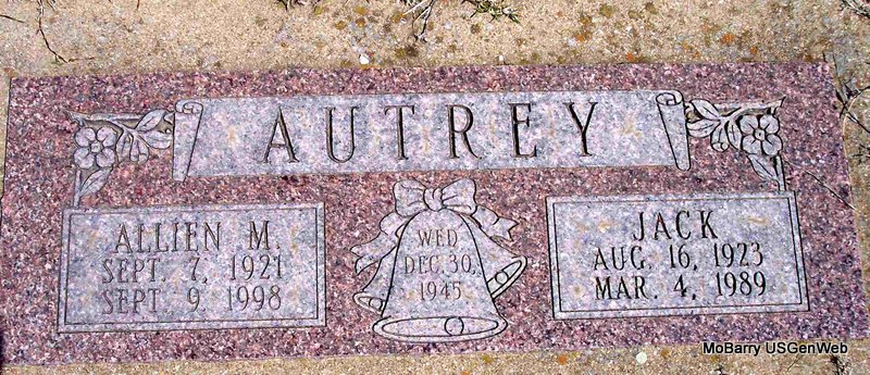 SSW: Allien M. - Inscription: "Wed Dec. 30, 1945" - Research Note: Son of Hiram L. and Ruth (King) Autrey. Father of Ruth, Nancy, Jack and Tom. | Obit Family Ruth Stubbs Photo Diana Cope |