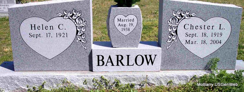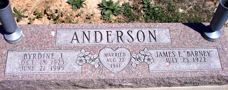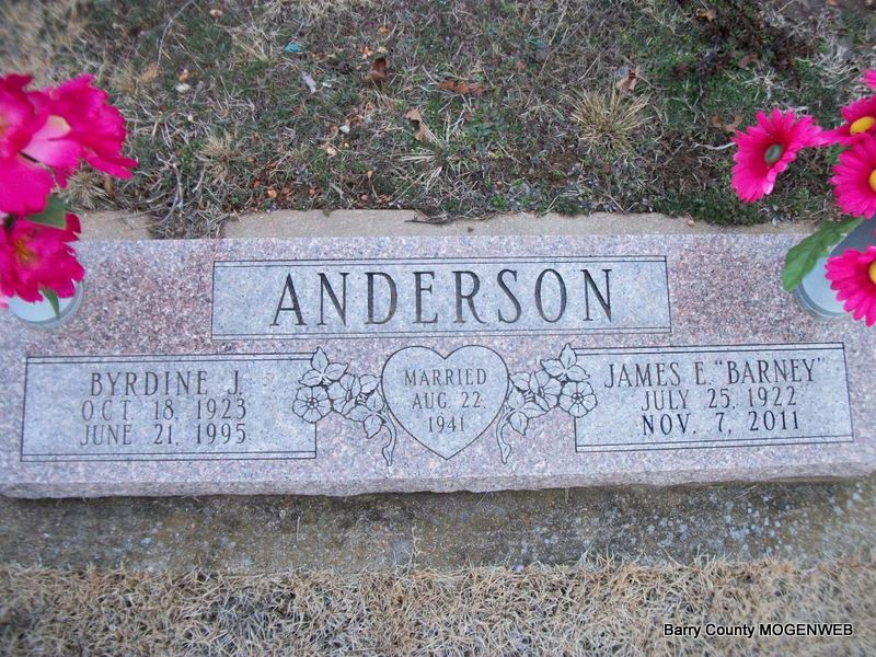 SSW: Byrdine J.- Inscription: "Married Aug. 22, 1941" - Research Note: Husband of Byrdine Jeanette (Haile) Anderson. Son of Charles and Mamie (Hall) Anderson. Father of Jim, Jean, Mary and Kay. On August 22, 1941, in Ozark, MO, he was united in marriage to Byrdine Haile, who preceded him in death on June 21, 1995. Also preceding him in death were his parents; three brothers, Everett, Emmett and Darrell Anderson; five sisters, Norma Reed, Gladys Tabor, Lois Davis, Rosetta Calvin and Eunice Scribner and two grandsons, Brian Anderson and Jim Harrell. Barney grew up and received his education at Ava, Missouri. In 1947, he moved from Springfield, MO to Cassville, where he was a mechanic for JC Kenny Motors and then owned and operated Cassville Distributing. For thirty years he belonged to the Cassville Volunteer Fire Department and was Fire Chief several years. - Another Photo | Granddaughter Obit Photos Diana Cope |