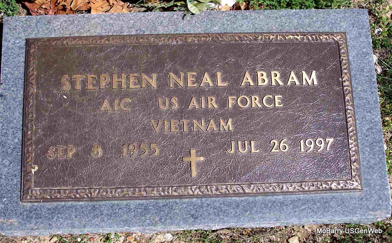 Inscription: "AIC US AIR FORCE VIETNAM" - Research Note: Son of Cecil and Mary Abram. Stephen was a 1974 graduate of Cassville High School and a U.S. Air Force Veteran. He was employed by J. C. McCullah Construction Co., Wheaton, before working for Hutchens Construction Co., Cassville. He was a member of the Ridgley Baptist Church. Married Sandy Wiseman on September 15, 1995 in Monett, Barry County, MO. | Obit Phyllis Long Photo Diana Cope |