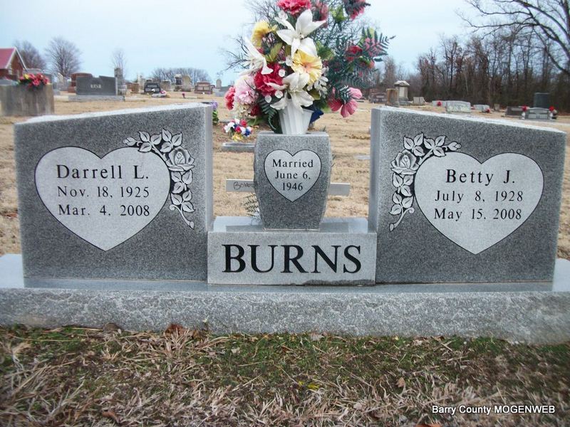 SSW: Betty Jean - Inscription: "Married June 6, 1946" - Research Note: Son of Robert and Hattie (McCracken) Burns. He served in the U.S. Marine Corp during World War II in Okinawa and other South Pacific islands. On June 6, 1946 he married Betty Craig who survives. To this union six children were born. During his life, he worked as a painting contractor in Tucson, Arizona, and logged in the northern California redwoods and in Alabama. In 1961 he bought a dairy and poultry farm east of Wheaton where he lived until his death. He was preceded in death by one son, David; his parents and six siblings: Irene Lancaster, Hartwell Burns, Floyd Burns, Gladys Powell, Lucille Franklin, and Aubrey Burns. - Another Photo | Advertiser May 28, 2008 Phyllis Long Photos Diana Cope |
