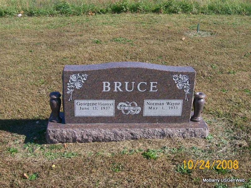 | BRUCE, Georgene (GENTRY) | June 13, 1937 | No Date | SSW: Norman Wayne - Inscription Married Aug. 21, 1955" - Research Note: Daughter of Ray H. Gentry and Bessie A. Vaughn. - Back of Stone | Census Phyllis Long Photo Jay Trace |