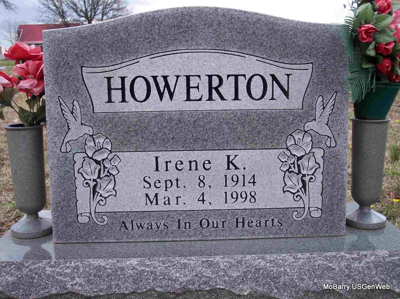 | HOWERTON, Irene K. | Sept. 8, 1914 | Mar. 4, 1998 | Research Note - She was a daughter of Audie Howerton and Maude McCracken. - Obit: Miss Howerton was born Sept. 8, 1914, in Barry County. She was a cashier and clerk at Modern Variety Store in Monett. She retired in 1984. She was a member of New Hope Baptist Church, Purdy. There are no immediate survivors. - 1920 Census, Corsicana, Barry Co., MO - Audie Howerton, age 26, born MO, parents born MO; Maude, wife, age 24, born MO, parents born MO; Irene, daughter, age 5, born MO. | Online Obit Census Phyllis Long Photo Diana Cope |