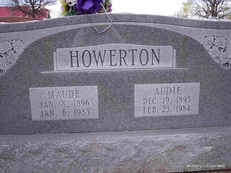 | HOWERTON, Maude (McCRACKEN) | Jan. 8, 1896 | Jan. 6, 1985 | SSW: Audie Howerton - Research Note: Rebecca Maude was a daughter of Alonzo L. and Adeline (Higgs) McCracken. Audie Howerton, age 19, married Maude McCracken, age 17, on Aug. 26, 1913 in Barry Co., MO. | Note Donna Cooper MO Marriage Records Phyllis Long Headstone Kay C. Morrow Photo Diana Cope |