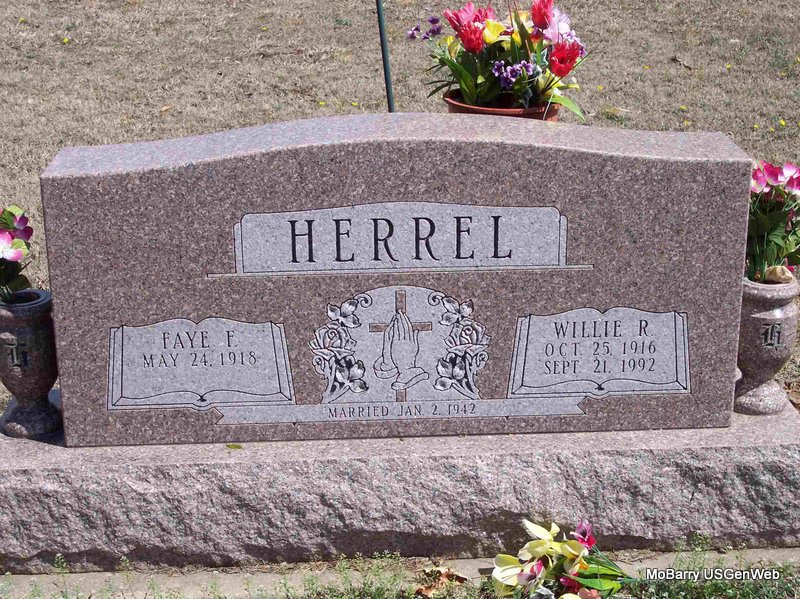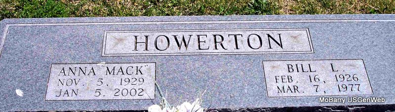 | HOWERTON, Bill L. | Feb. 16, 1926 | Mar. 7, 1977 | SSW: Anna "Mack" Howerton - Research Note: He was the son of John William and Lela Howerton. - 1930 Census, Independence, Montgomery Co., KS J. W. (John William) Howerton, age 29, married at age 24, born MO, father born MO, mother IN; Lela, wife, age 23, married at age 18, born OK; Bill, son, age 4, born KS; James Robert, son, age 2, born MO. - Bill L. Howerton is listed on the Barry Co., MO Courthouse Wall as a WW II Veteran. | Census Phyllis Long Headstone Kay C. Morrow Photo Diana Cope |