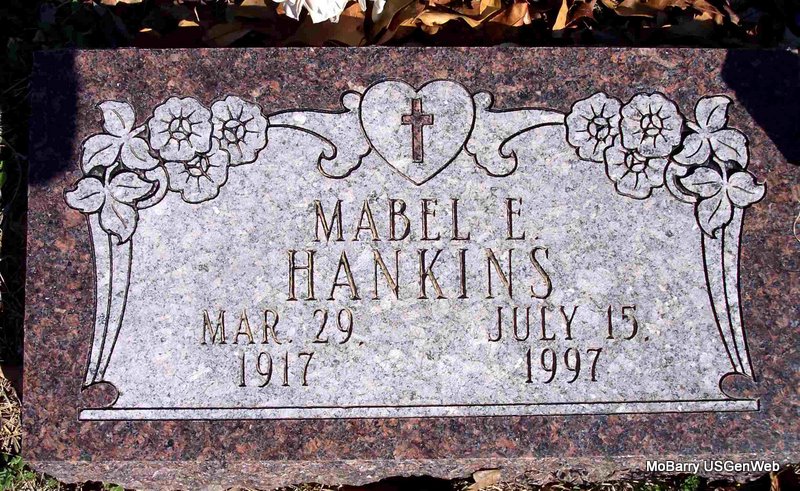 | HANKINS, Mabel Eunice (HAYNES) | Mar. 29, 1917 | July 15, 1997 | Research Note: She was the wife of Coleman Hankins. Mabel, age 19, married Coleman, age 22, on May 19, 1936 in Mt. Vernon, Lawrence Co., MO. Daughter of Phillip Haynes and Edna Mae Brown. | MO Marriage Records Census Phyllis Long Photo Diana Cope |