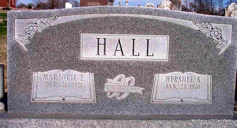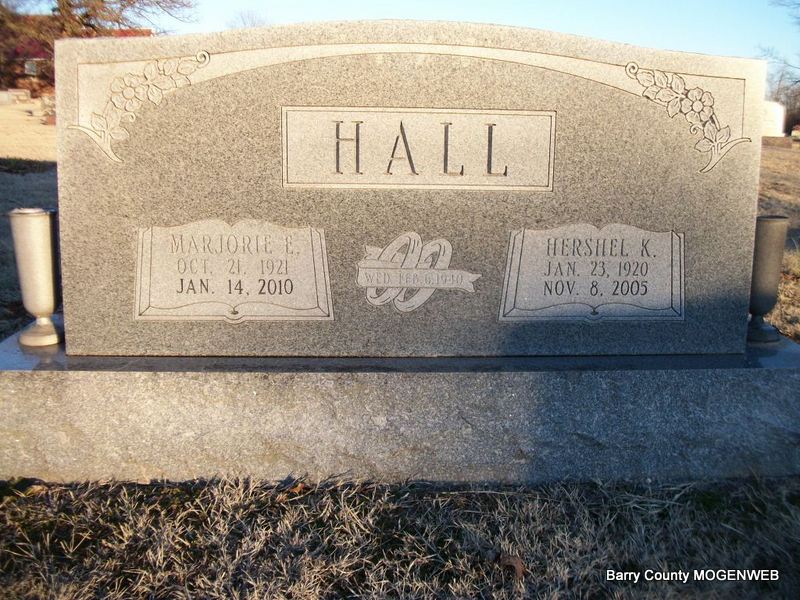 SSW: Marjorie Elizabeth - Inscription: "Feb. 6, 1940" - Research Note: He was a Purdy, MO resident and a son of Homer Daniel and Nora Myrtle (Ennis) Hall. He married Marjorie Elizabeth Douthitt in Butterfield on Feb. 6, 1940. He was preceded in death by his parents, three sisters, Alma Myers, Juanita Miller and Clara Mae Horner, and one brother, Don Hall. - Another Photo - Another Photo | Cassville Democrat Phyllis Long Photo Jay Trace Photos Diana Cope |