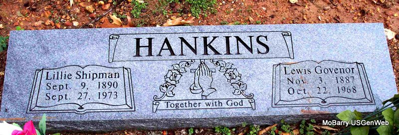 SSW: Lewis Govenor - Research Note: Nancy Lillie Shipman was the daughter of Abel Burton Shipman and Minerva Ann Nelson. Nancy L. Shipman, age 22, married Lewis G. Hankins, age 25, on Dec. 25, 1912 in Barry Co., MO. | Census MO Marriage Records SS Claims Index Phyllis Long Photo Diana Cope |