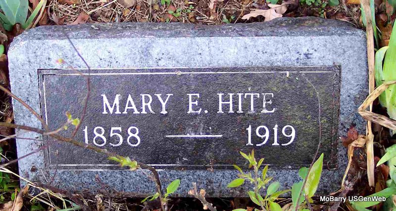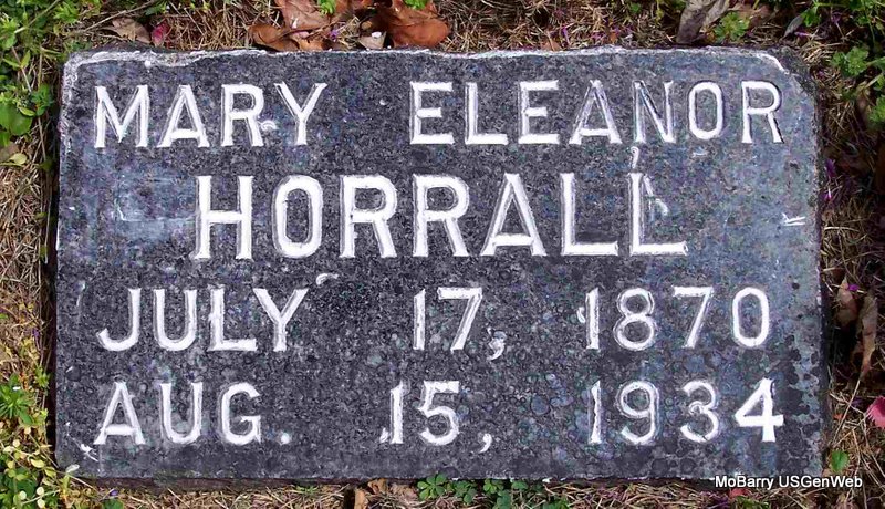 Research Note: Daughter of James Blakeslee and Celestia J. Bracken, both buried at Mt. Pleasant Cemetery. William F. Horrall and Mary E. Blakeslee were married on May 6, 1888 in Barry Co., MO. - Plot Stone | Mother's Obit MO Marriage Records Phyllis Long Photo Diana Cope |