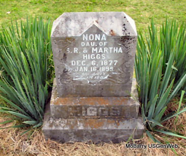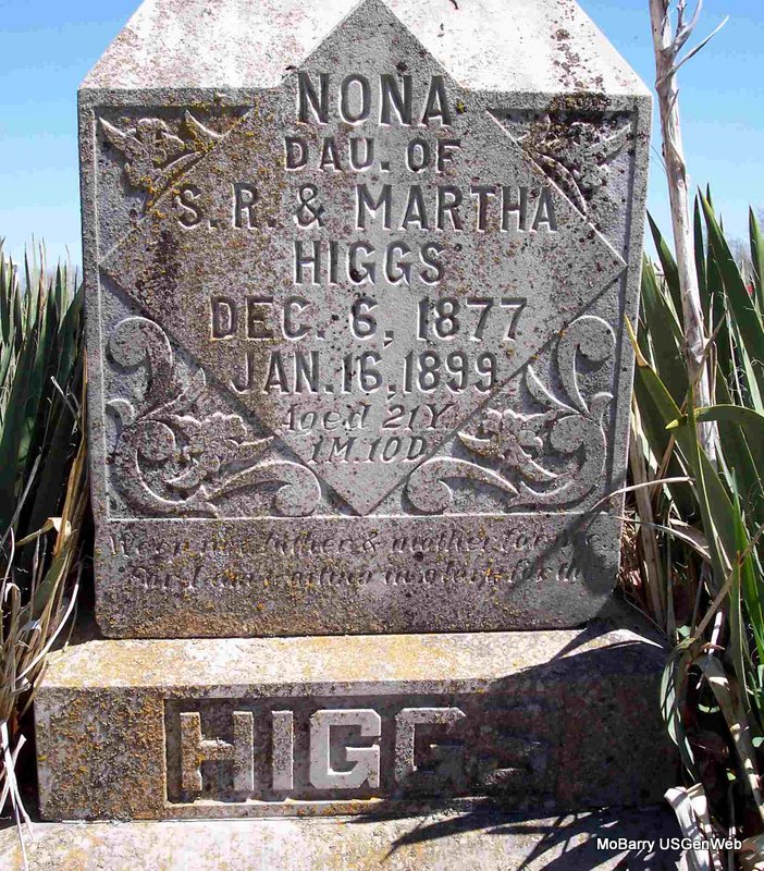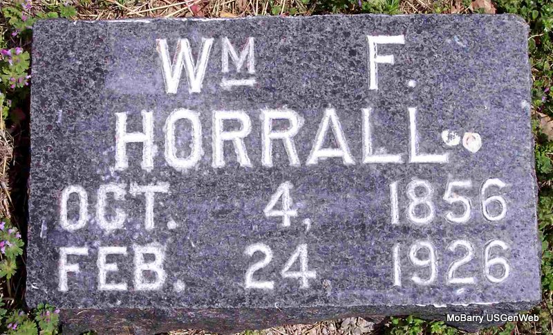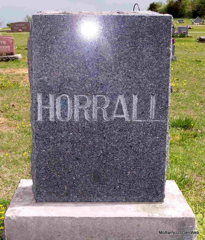 Research Note: William F. Horrall and Mary E. Blakeslee were married on May 6, 1888 in Barry Co., MO. - Cassville Republican, Jan. 24, 1895 - W. F. Horrall of Capps Creek, who spent Saturday in the city informed us that he had traded places with Mr. Teel of near Purdy. - Cassville Republican, August 1, 1901 - Badly Cut: John Blankenship and William Horrall engaged in an altercation at Corsicana Saturday and the later was badly cut by a knife in the hands of Blankenship. From best reports it seems that Horrall's son and Blankenship had become engaged in a dispute the day before over some cattle of Horrall's that had jumped in Blankenship's pastured land. The affair did not stop at that point. Saturday William Horrall and Blankenship met and another dispute arose. Hot words were passed and a fight ensued. Horrall received a cut just over the left lung and one on the neck. For awhile it looked as though the wound over the lung might prove fatal but at latest reports Mr. Horrall was getting along nicely. - Plot Stone | MO Marriage Records Online Newspapers Phyllis Long Photo Diana Cope |