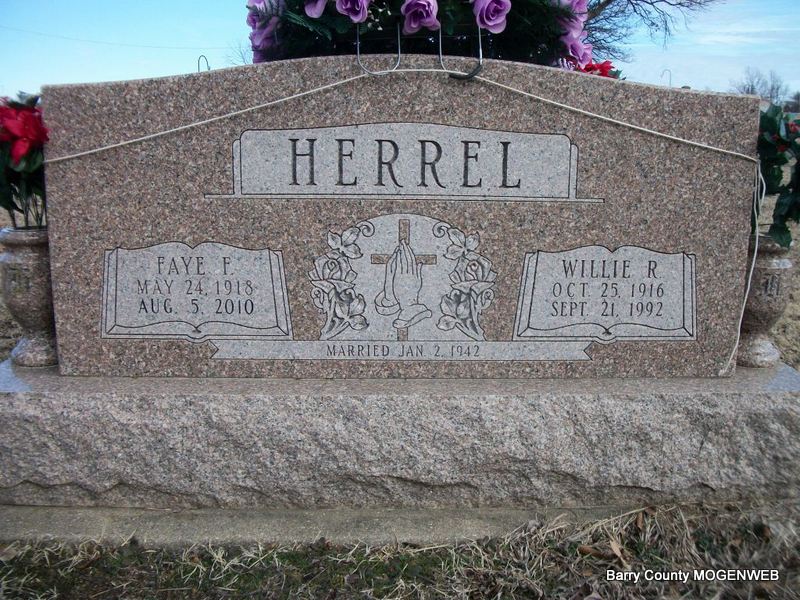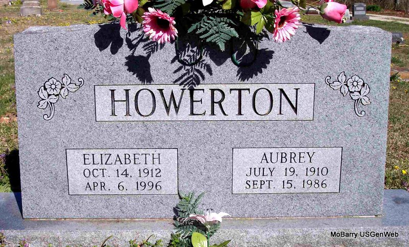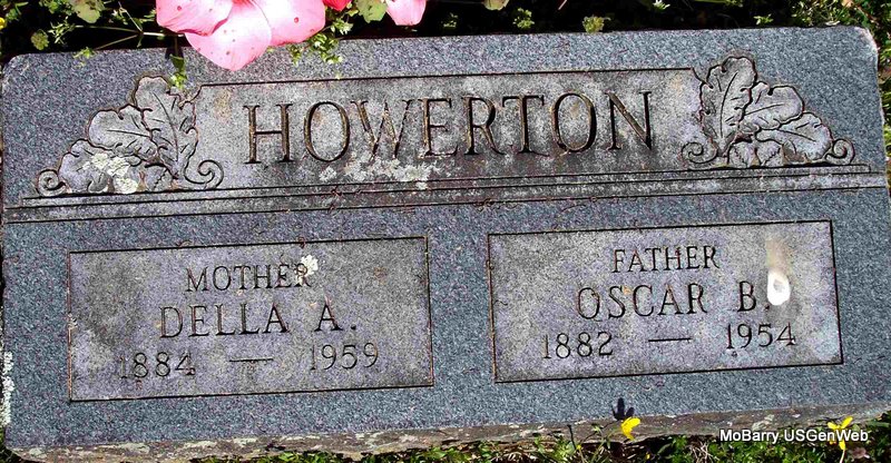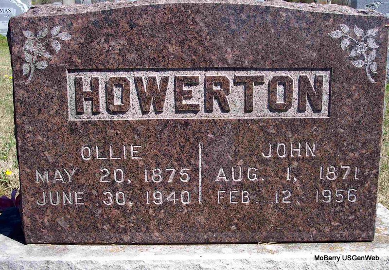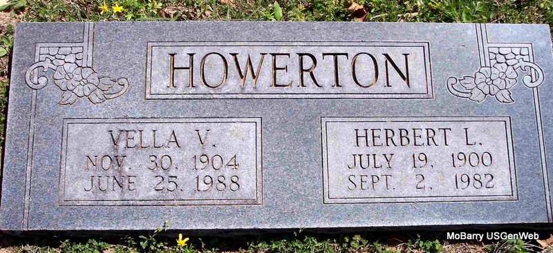 | HOWERTON, Herbert L. | July 19, 1900 | Sept. 2, 1982 | SSW: Vella V. (Whittington) Howerton - Research Note: Son of John J. Howerton and Ollie Goodwin. - 1920 Census, Exeter, Barry, Missouri - John J. Howerton, age 48, born MO; Ollie, wife, age 44, born MO; Herbert, son, age 19, born MO; Willie, daughter, age 16, born MO; Lee, son, age 14, born MO; Lester, son, age 14, born MO; Opal, daughter, age 11, born MO; Irene, age 10, born MO. | Census Phyllis Long Headstone Kay C. Morrow Photo Diana Cope |