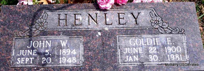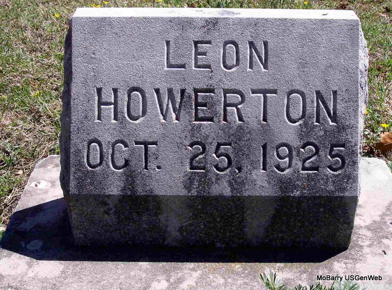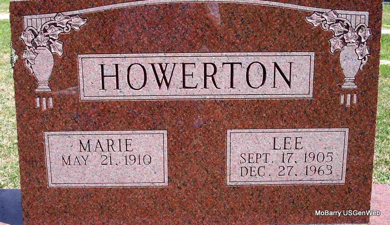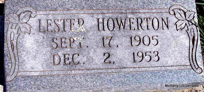 | HOWERTON, Lee | Sept. 17, 1905 | Dec. 27, 1963 | SSW: Marie Howerton - Research Note: He was a son of John J. Howerton and Ollie Goodwin. A twin to Lester. 1920 Census, Exeter, Barry, Missouri - John J. Howerton, age 48, born MO; Ollie, wife, age 44, born MO; Herbert, son, age 19, born MO; Willie, daughter, age 16, born MO; Lee, son, age 14, born MO; Lester, son, age 14, born MO; Opal, daughter, age 11, born MO; Irene, age 10, born MO. | Headstone Kay C. Morrow Census Phyllis Long Photo Diana Cope |