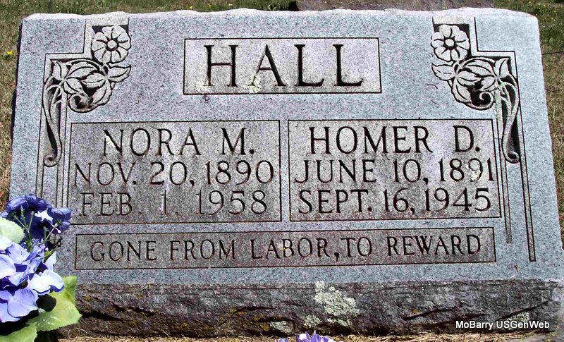 SSW: Nora M. - Research Note: His wife was Nora and he was a farmer. Son of Vance Columbus Hall and Katie Mae Hutchins both born MO. Mrs. Rufus Miller was the informant on the death certificate. Homer Hall age 20, married Nora Ennis, age 20, on June 11, 1911 in Barry Co., MO. - Mother's Obit | Death Certificate MO Marriage Records Phyllis Long Photo Diana Cope |